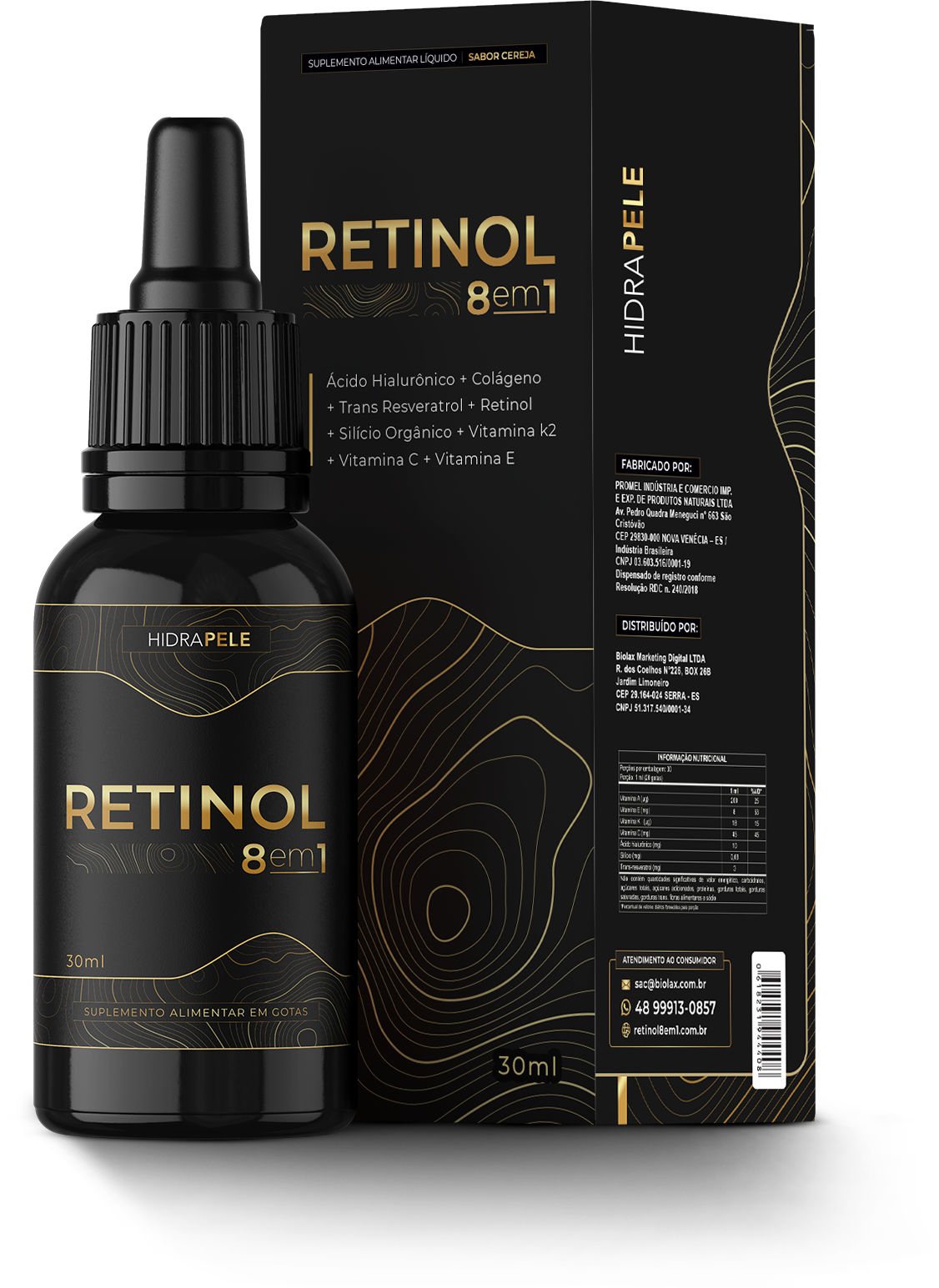 O tratamento Retinol 8 em 1 + Vitamina K2 está em conformidade com a ANVISA e possui uma fórmula exclusiva para eliminar as rugas, marcas de expressão, pés de galinha e bigode chinês de forma natural. Várias marcas no mercado brasileiro estão se passando por RETINOL 8 EM 1, só que não fornecem resultados esperados para os clientes, então saiba que se você usar um produto realmente asiático suas rugas e marcas de expressão literalmente desapareceram em algumas semanas de tratamento!